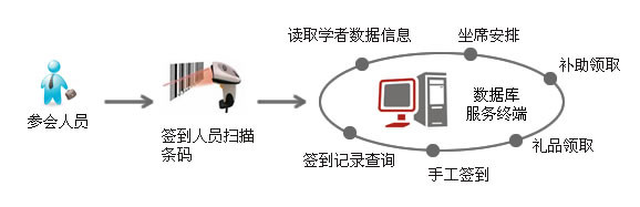 2、 参会者在会议现场凭此单签到,办会方可以通过手持终端扫描二维条形码,从而快速获得该参会者姓名、单位、费用支付与否等信息,并将签到信息写入数据库中,实现快速签到。